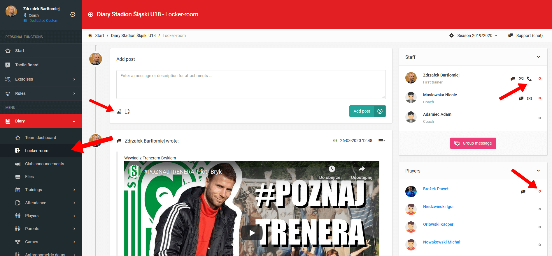 გასახდელი და დაფა ფუნქციონირებს როგორც დახურული მომხმარებელთა ჯგუფი, სადაც შეგიძლიათ გააზიაროთ ფაილები, ვიდეოები, ფოტოები ან ბმულები. გარდა ამისა, აქ შეგიძლიათ წამოიწყოთ ჯგუფური საუბარი არჩეულ მომხმარებლებთან, ასევე პირადი საუბარი ერთ კონკრეტულ მწვრთნელთან. გასახდელი და დაფა ასევე ხელმისაწვდომია მობილური აპლიკაციის მეშვეობით, და ყოველი პოსტი, რომელსაც დაამატებთ, აგზავნის push შეტყობინებას არჩეული მომხმარებლებისთვის.