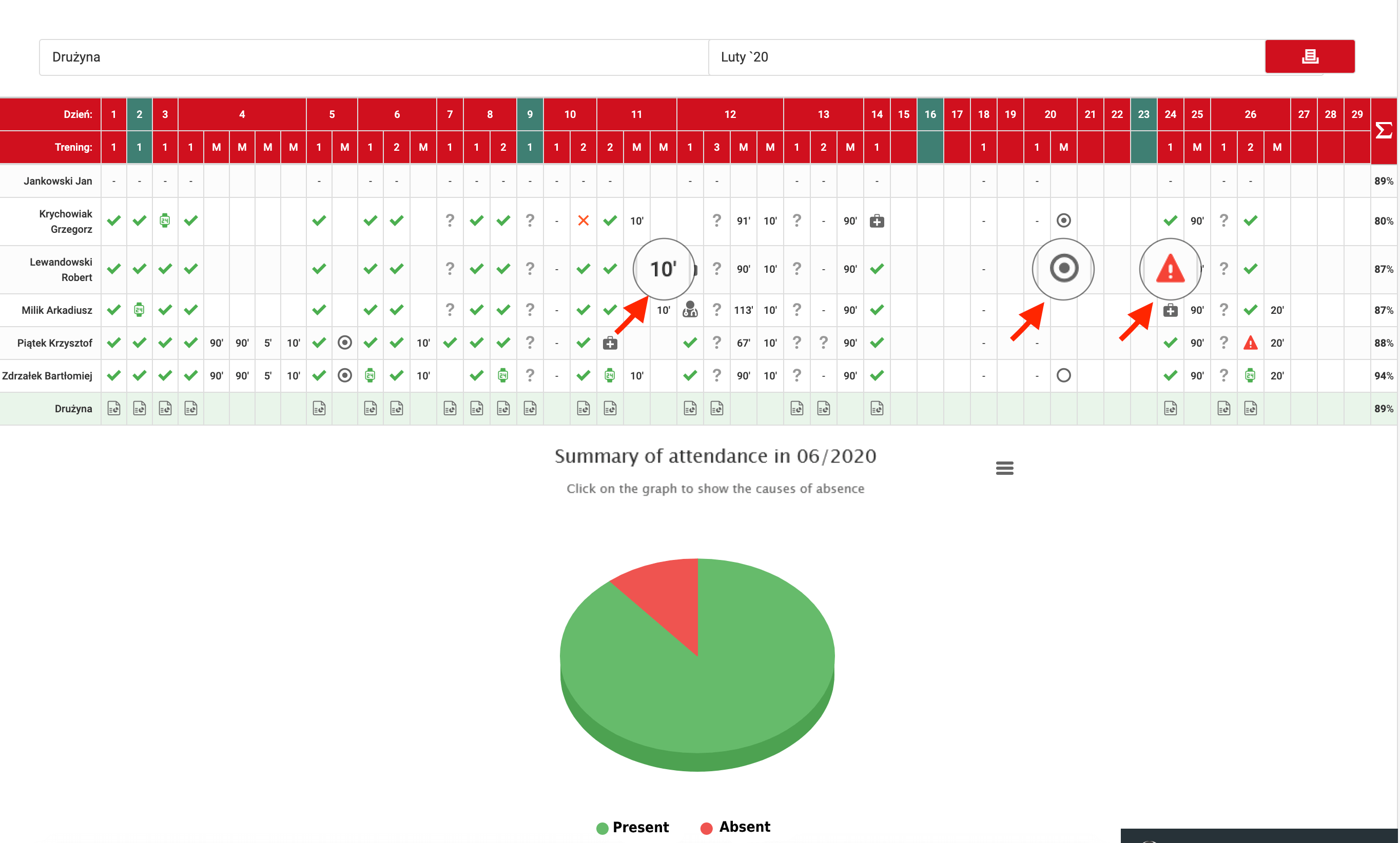 Tabulā apkopoti dati par treniņiem un spēlēm. Ikonas simbolizē spēlētāja klātbūtni treniņā vai viņa prombūtnes iemeslu. Simboli spēlēm (tukšs aplis vai pilns aplis) norāda uz izsaukumu pirmajā sastāvā vai uz rezervistu soliņa. Ja jūs aizpildāt spēles statistiku, tabulā parādīsies spēlētāja nospēlētais laiks. Lapas augšdaļā ir izvēles rūtiņas, kas ļauj mainīt attēlotos mēnešus, kā arī sašaurināt tabulas statistiku līdz vienam izvēlētam spēlētājam. Pēdējā kolonnā un pēdējā tabulas rindā jūs atradīsiet kopsavilkumu par spēlētāja apmeklējumu mēnesī un komandas apmeklējumu konkrētā treniņa sesijā.