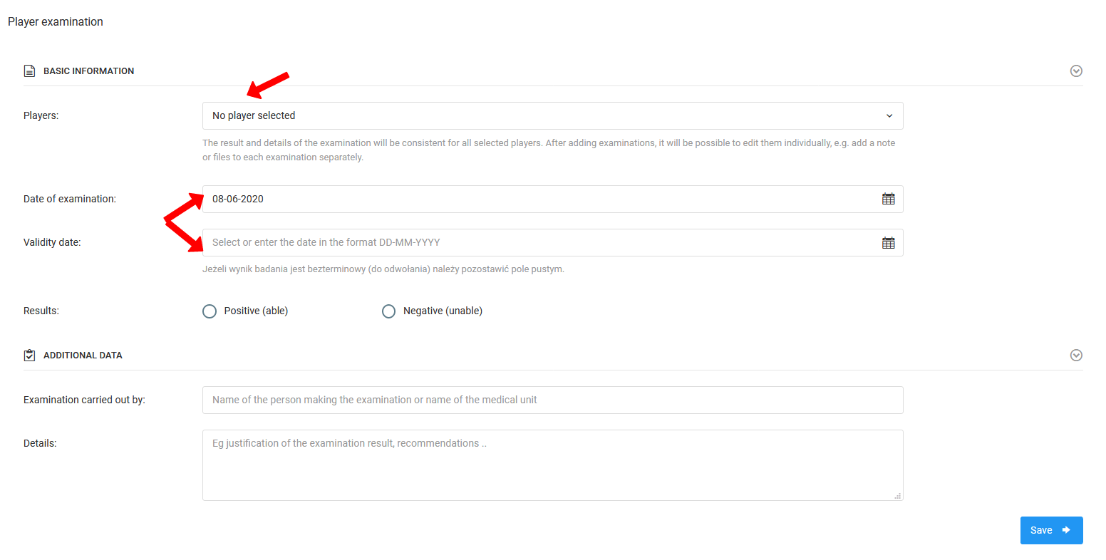 Lai ievadītu informāciju par medicīniskajām pārbaudēm, kreisajā izvēlnē izvēlieties dienasgrāmata pārbaudes pievienot pārbaudi. Kad uz tās noklikšķināsiet, jūs tiksiet novirzīts uz informācijas ievades lapu par pārbaudi. Šajā lapā jums būs vairāki svarīgi elementi, ko ievadīt. Pirmais ir to spēlētāju saraksts, kas iesaistīti pārbaudē. Tie var būt visi spēlētāji, konkrēta grupa vai viens spēlētājs. Nākamie svarīgie lauki ir: pārbaudes datums un pārbaudes derīguma termiņš. Turklāt jūs varat atzīmēt pārbaudes rezultātu (spējīgs/nespējīgs) un pievienot pārbaudi veikušās personas datus.