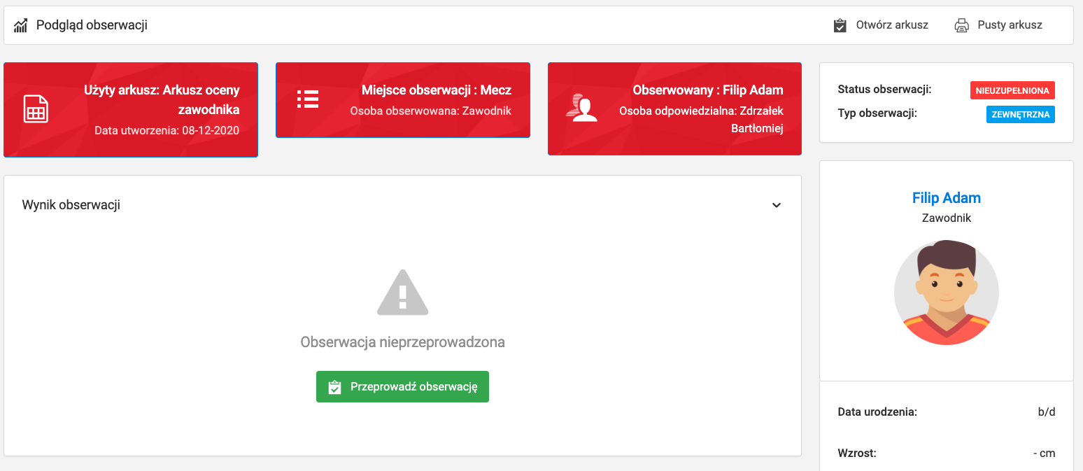 Aby przejść do uzupełniania arkusza obserwacji należy kliknąć zielony przycisk „przeprowadź obserwację”. Po kliknięciu w przycisk, zostaniesz przeniesiony do arkusza obserwacji. To właśnie w tym widoku będziesz uzupełniał konkretne wartości elementów, które będziesz oceniał u obserwowanej osoby.
